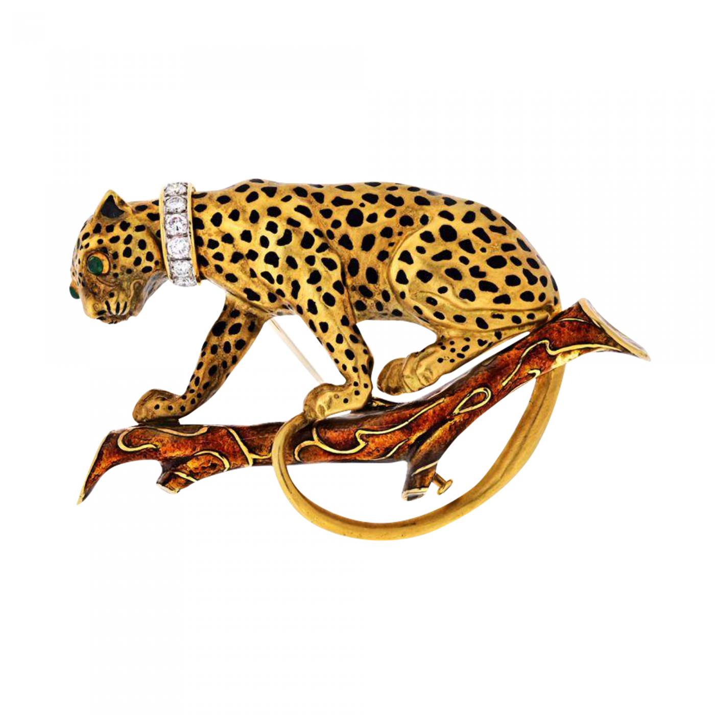 Designed as a sculpted gold panther with brown and black enamel, a diamond collar and emerald eye.