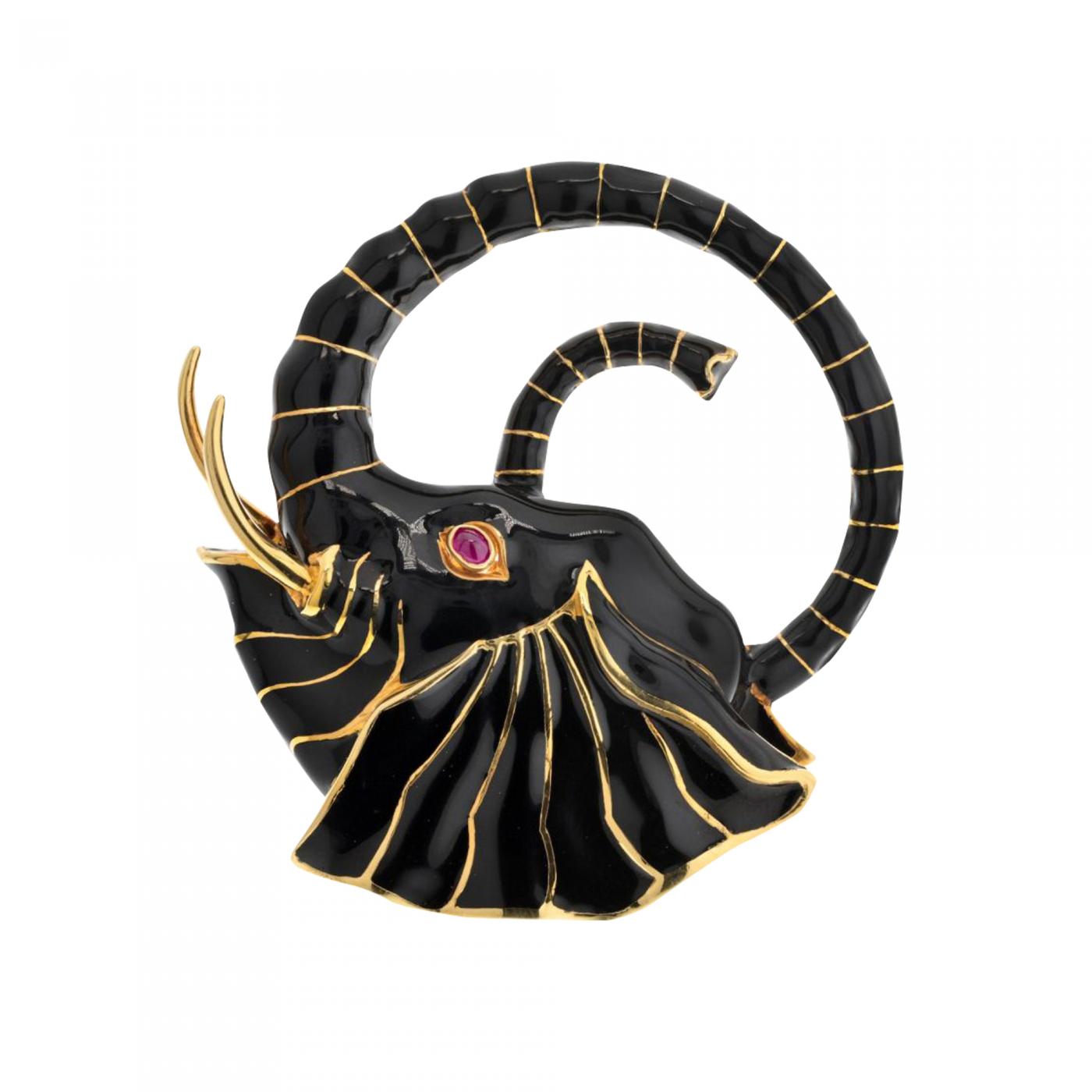 Indulge in the majestic allure of the David Webb Platinum & 18K Yellow Gold Black Enamel Elephant Brooch. This exquisite piece of wearable art is designed as a masterful fusion of black enamel and sculpted 18k gold, capturing the regal essence of an elephant. The elephant head, with a captivating cabochon ruby eye and a high-polished gold tusk, exudes both strength and grace.