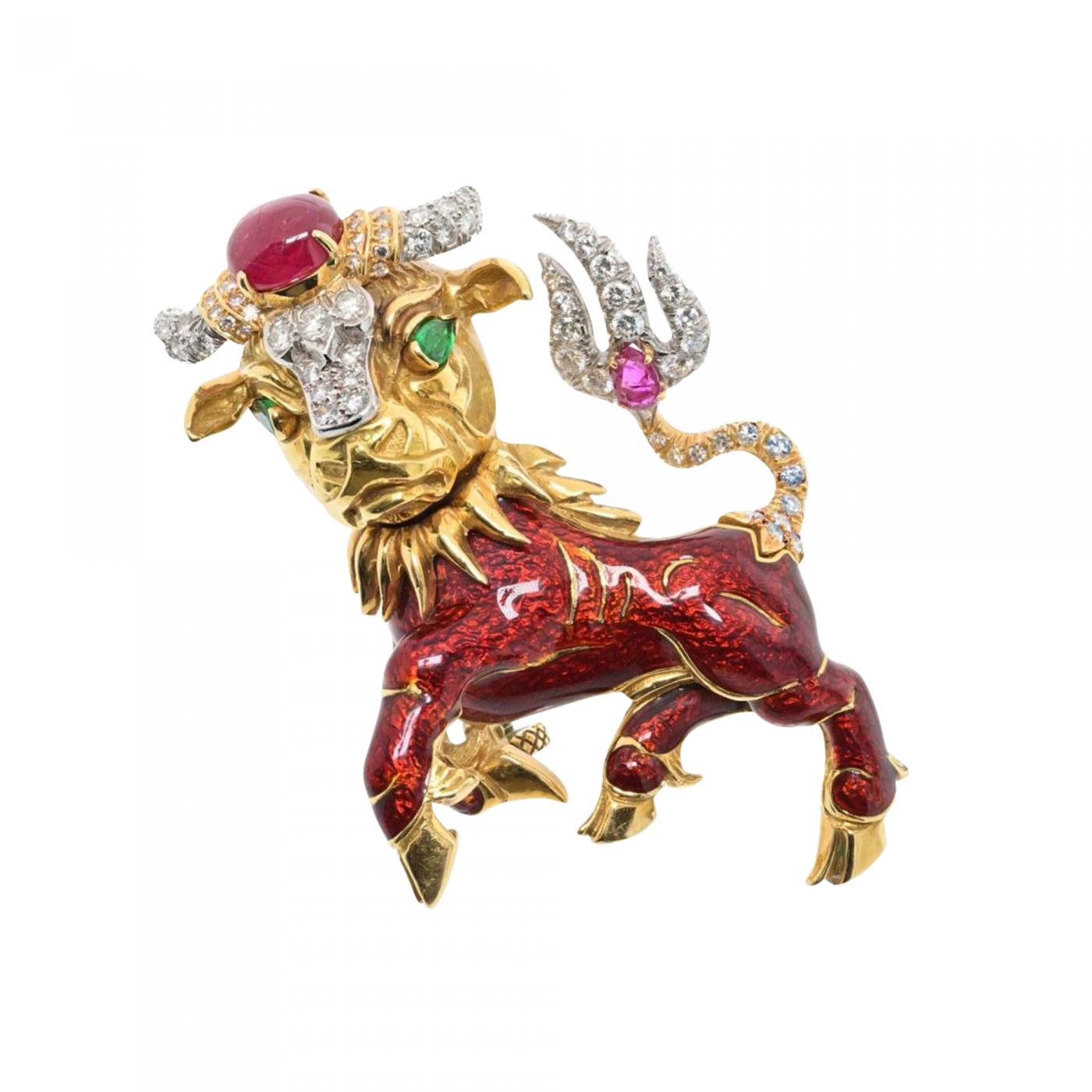 DAVID WEBB PLATINUM & 18K YELLOW GOLD RED ENAMEL BULL BROOCH
