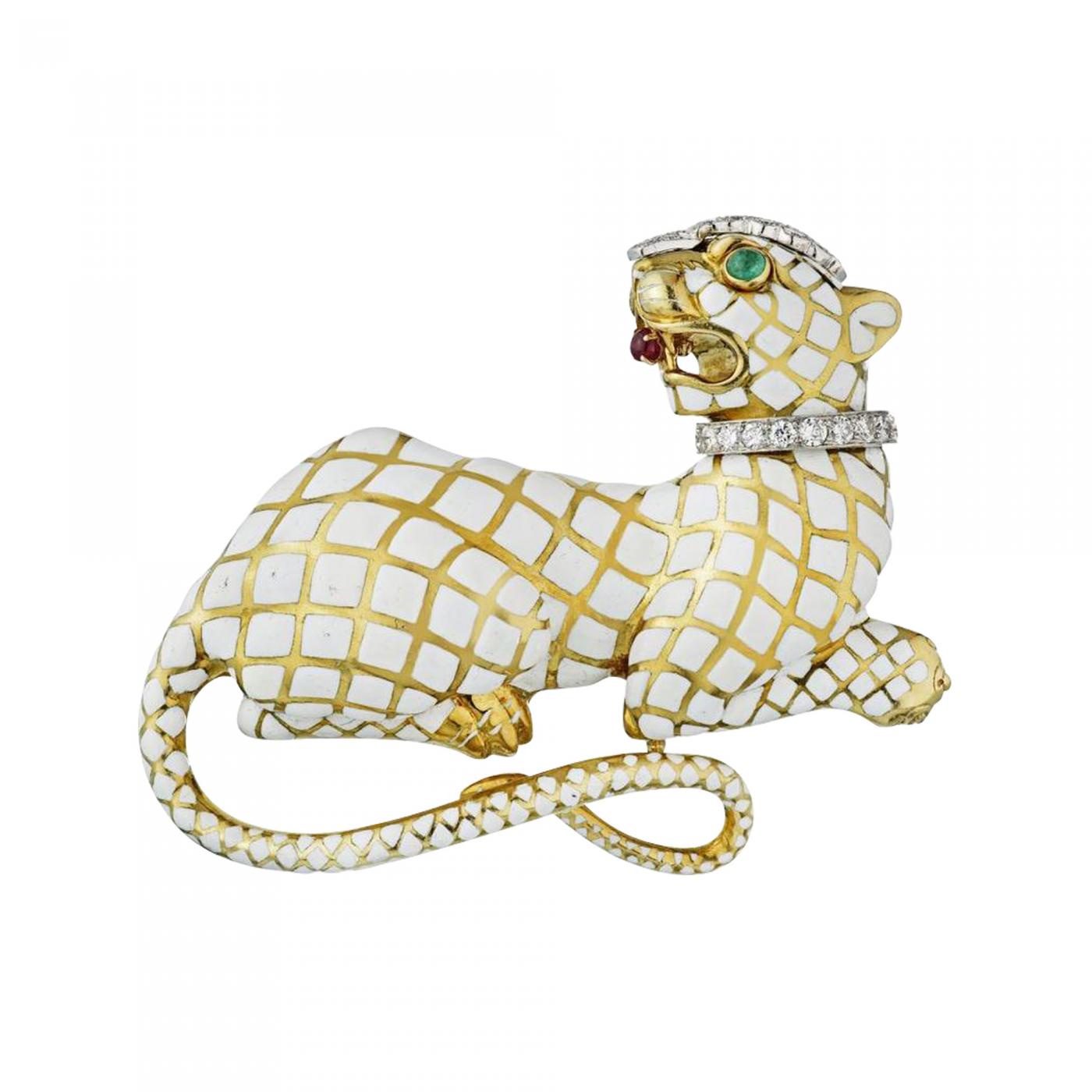An important Leopard Panthere brooch by David Webb decorated with white enamel, diamonds and emerald eyes. Circa 1970s