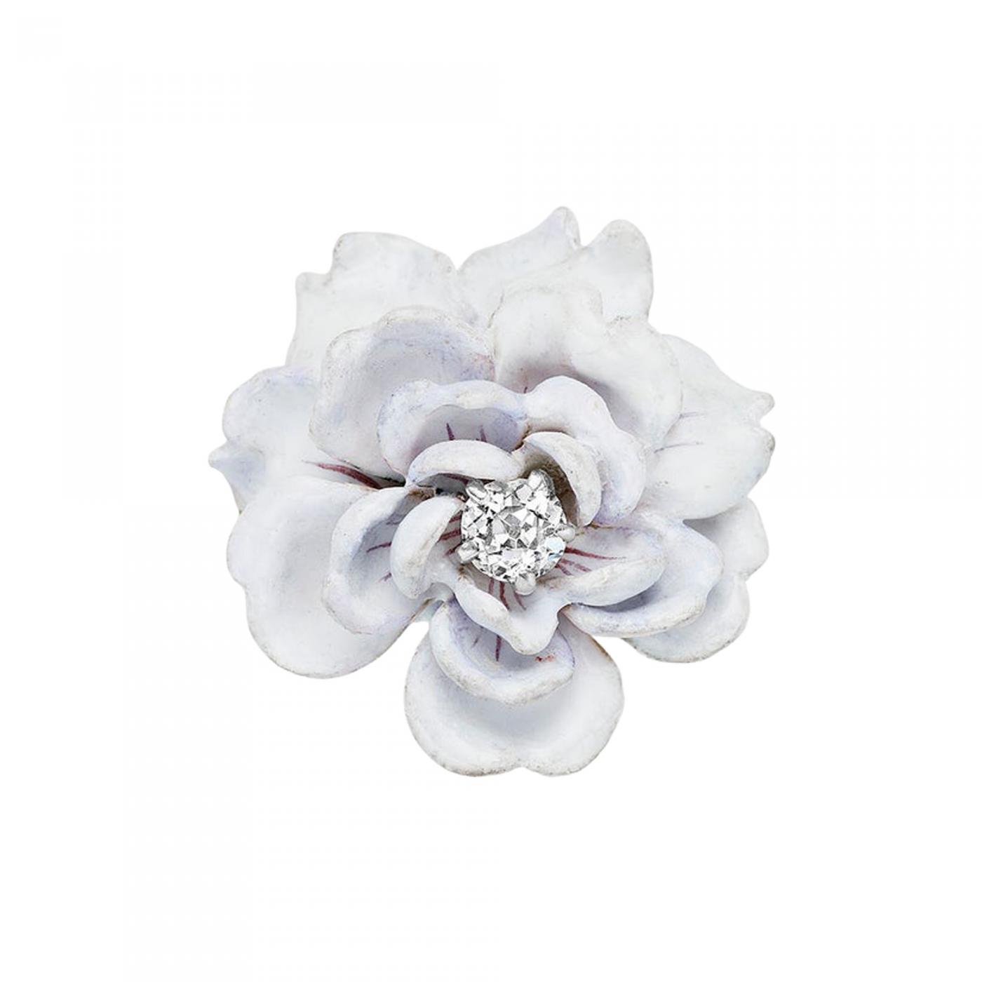 Created around 1895-1900, shortly after the firm's triumph at the 1889 Paris Exposition, this white enamel gardenia brooch in 18K gold belongs to an enduringly popular Tiffany & Co. collection of orchids and garden flowers. Rare, diminutive and and exquisitely modeled, the brooch is a poetic example of Tiffany's long and multi-faceted exploration of the beauty of flowers.
