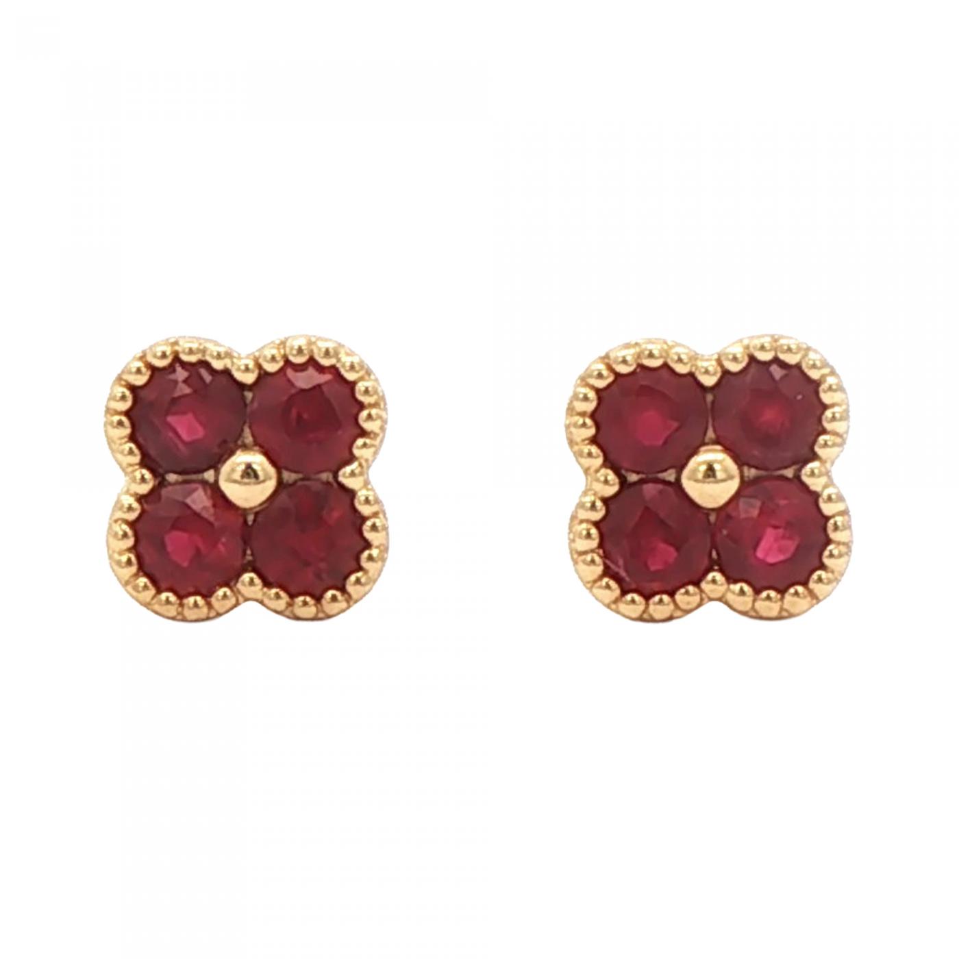 Elegant 18kt yellow gold earrings featuring a charming clover design. Each earring showcases four round rubies for a stunning total of eight vibrant stones. With a combined carat weight of 0.61cts, these pieces offer timeless sophistication and a pop of rich color perfect for any occasion. 6.2mm wide