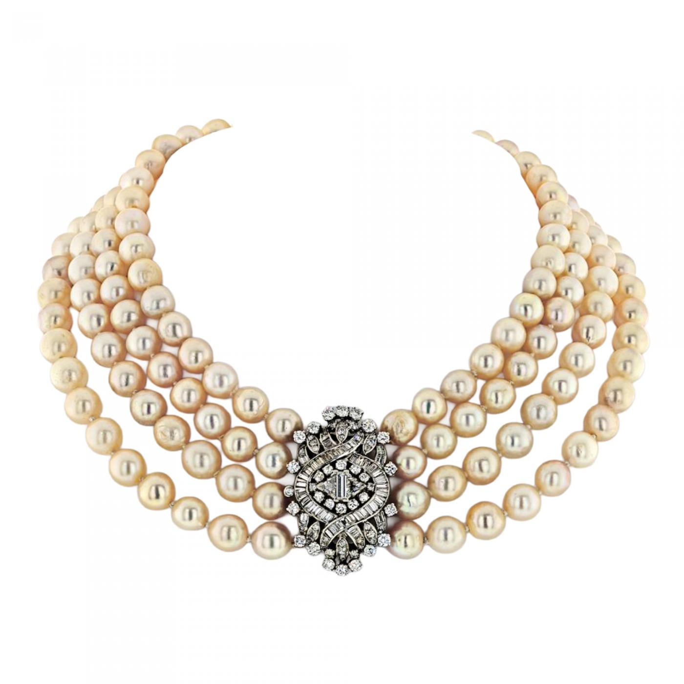Lustrous four strings of creamy pearls and diamond clasp choker necklace. Clasp is crafted in platinum and holds approx. 8 carats of round and baguette cut diamonds.