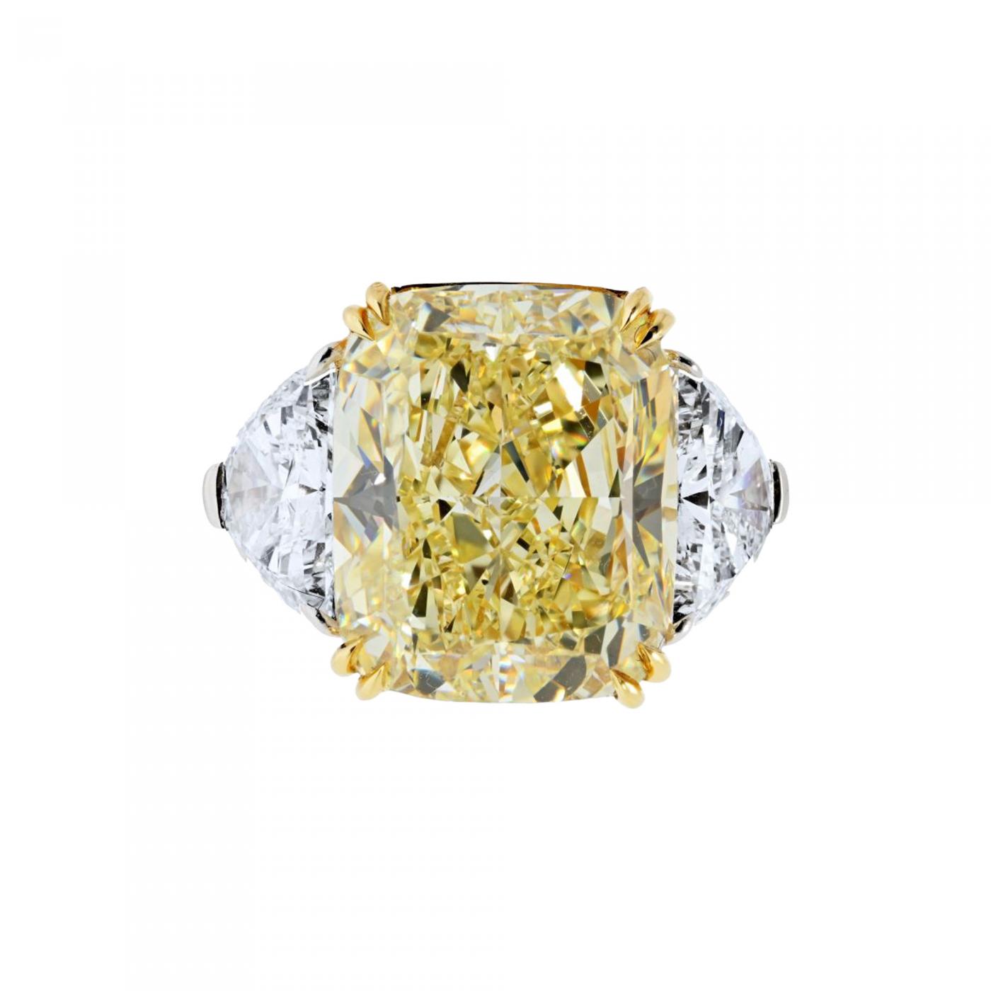 Center Diamond: 13.89ct Elongated Fancy Yellow Cushion Cut