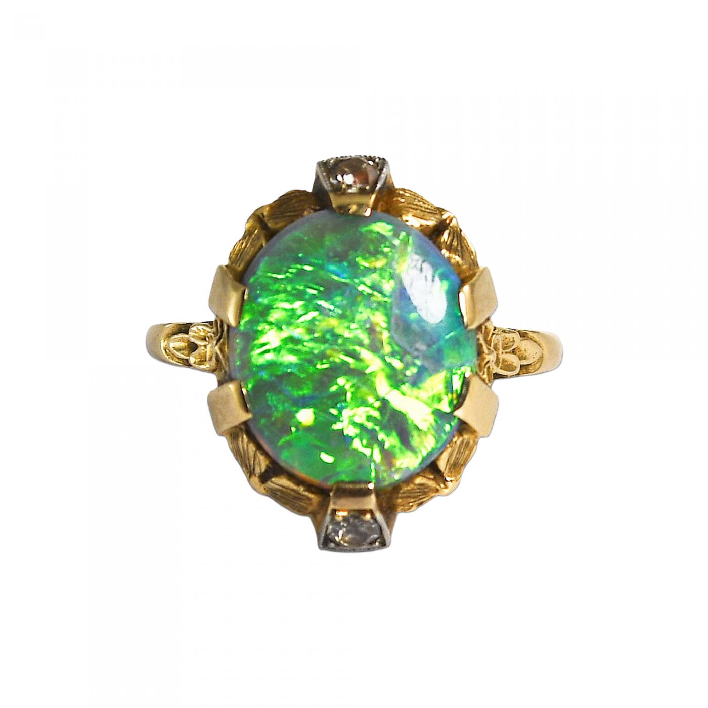 Vintage opal and diamond ring in 14k yellow gold floral design mounting.