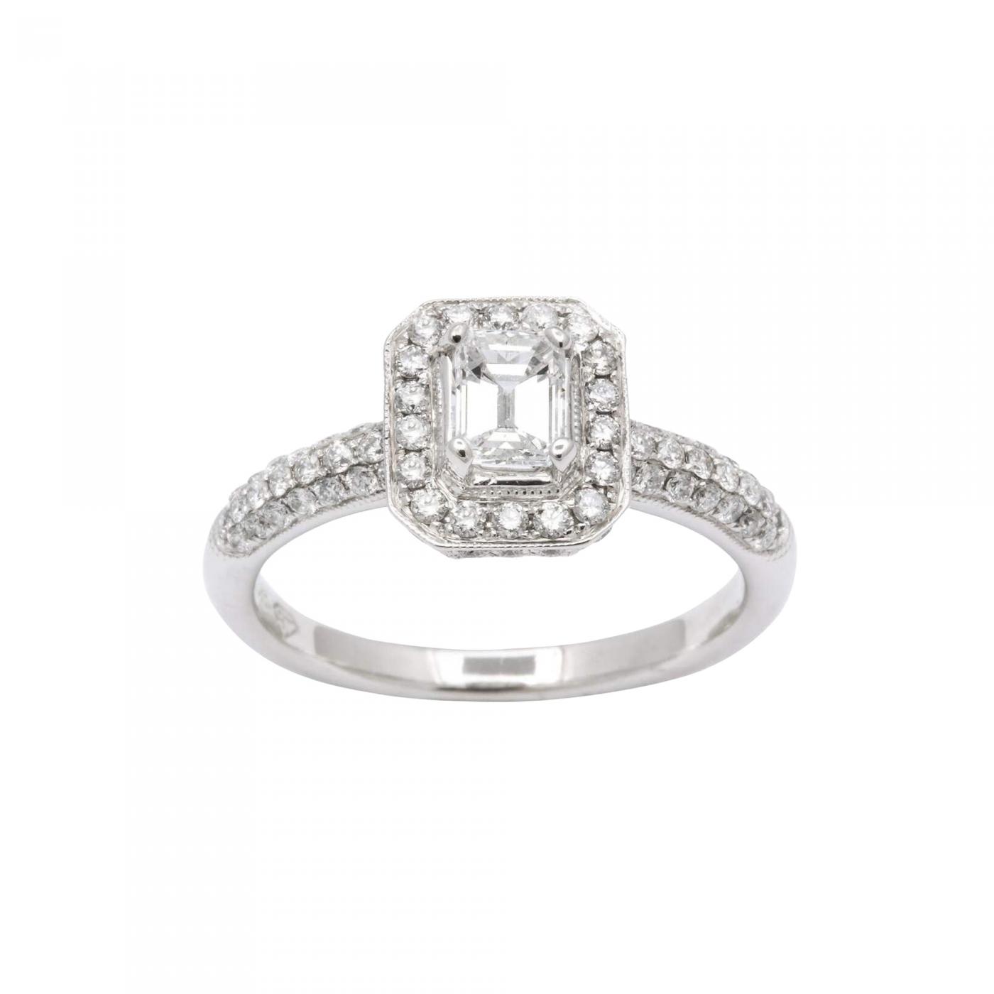 A dazzling Art Deco VS I diamond engagement ring. A center emerald cut .50 diamond is framed by .50 a group of small diamond set on a platinum mount.