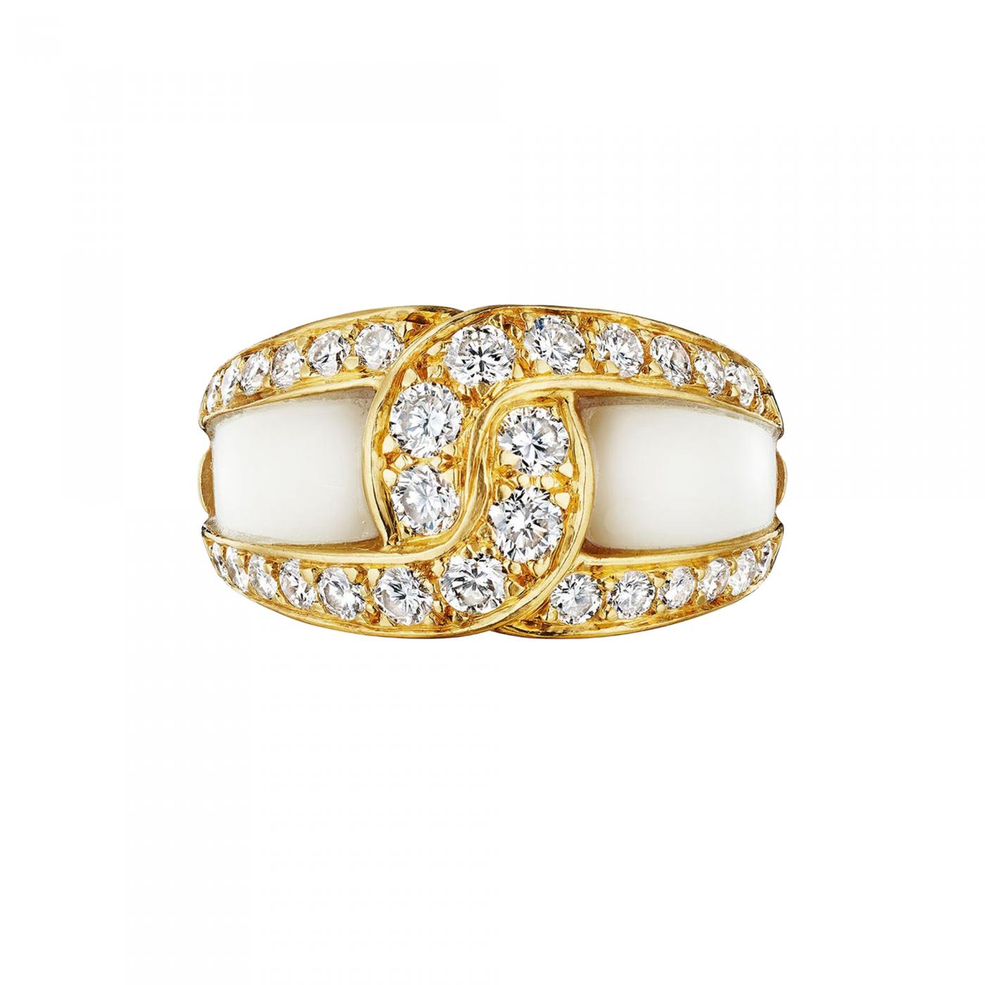 Made in Paris in the 1970s, this Van Cleef & Arpels mother-of-pearl and diamond ring is set in 18K gold. The ring is designed as curving, intertwined bands of diamonds framing two carved, slightly bombé mother-of-pearl panels, with a tapering 18K gold fluted shank. A Van Cleef & Arpels classic of the '70s, this modern design presents pleasing fusion of sparkling white brilliance and luminous iridescent luster.