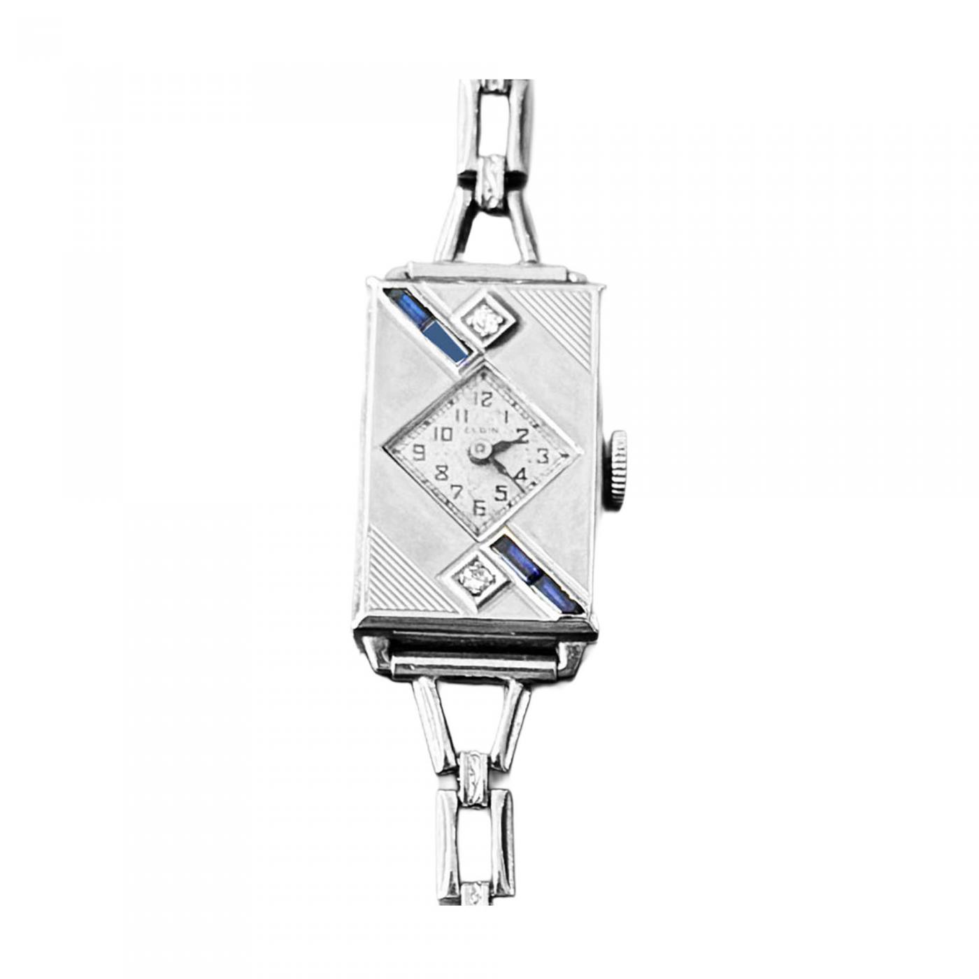 This rare Art Deco Elgin watch is 14K white gold with a14K White gold band. It has 2 diamonds and four hand cut sapphires, It has been mechanically serviced and keeps time.
