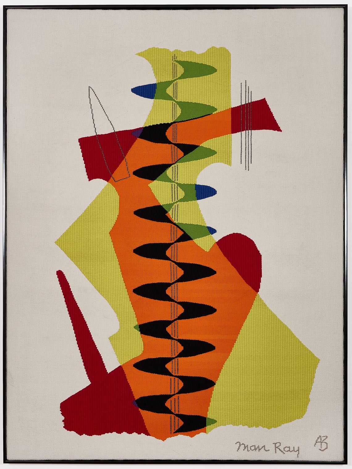 The Revolving Door tapestry series was based on a series of original collages created in 1916, which were first exhibited in 1919 at the Daniel Gallery in New York. The 1973 recreation of the early collages as wool tapestries, under Man Ray’s direction, has resulted in far more striking images that preserve the graphic clarity of the original designs while adding tactility and rich dimensionality characteristic of the tapestry medium.