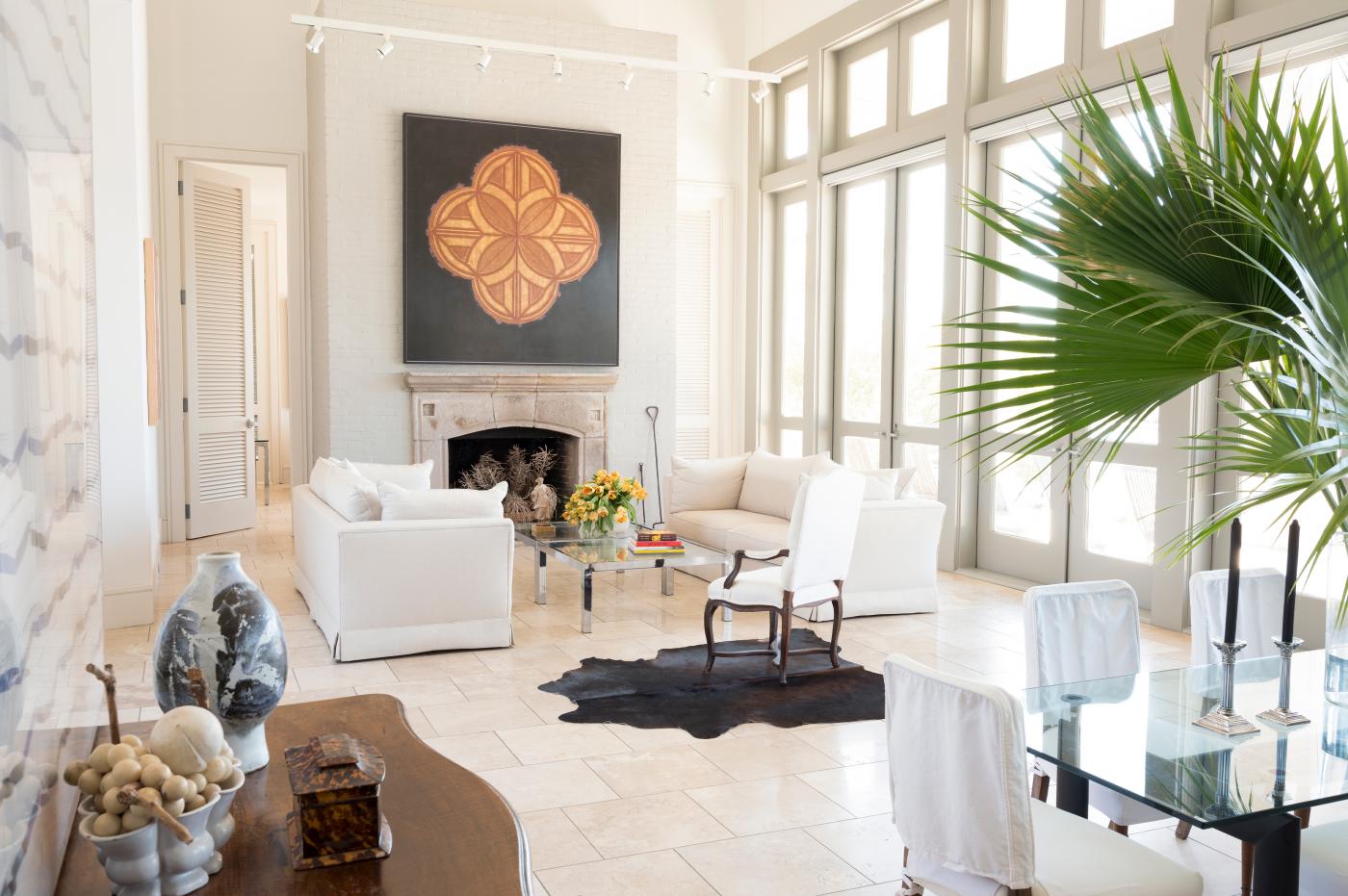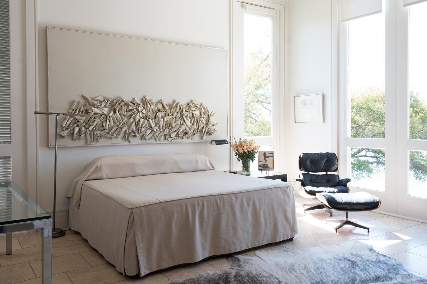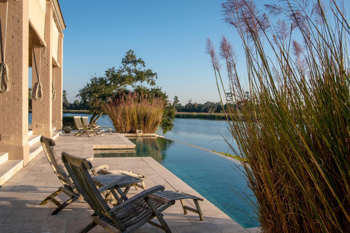 This 2,500 square foot house for an artist is a contemporary interpretation of West Indies architecture indigenous to south Louisiana. Occupying the high end of a peninsula where two bayous intersect, the home has limitless views across the water to protected marshlands. The new house is separated from the artist’s studio by an artesian spring fed pond, which meanders through a grove of Live Oaks and beds of native lilies and elephant ears. Similar to the studio, the house is loft-like with huge glazed doors. Travertine floored rooms unfold one onto another, and walls terminate well below the ceiling. Thus, the entire volume can be appreciated from the interior. Though modest in size, the soaring, twenty-foot ceiling gives the effect of much more space, a feeling reinforced by the wall of glass addressing the expansive wetlands. The sense of space is also heightened by the vanishing edge of the lap pool, whose spring-fed water spills over the retaining wall and merges with the bayou beyond. Contemporary furniture complements the owner’s collection of French and Italian antiques.