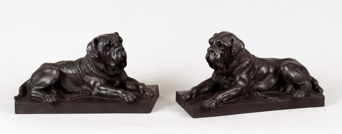 Pair of Cast Iron Mastiffs, Mid 19th Century Each well cast, with an expressive face, hanging jowls and floppy ears, resting on a plinth base, 9" x 4" x 5" high. $950/pr. Offered by Robert Morrissey Antiques & Fine Art For further information call 314.560.5006, email robert@robertmorrissey.com or visit www.robertmorrissey.com |