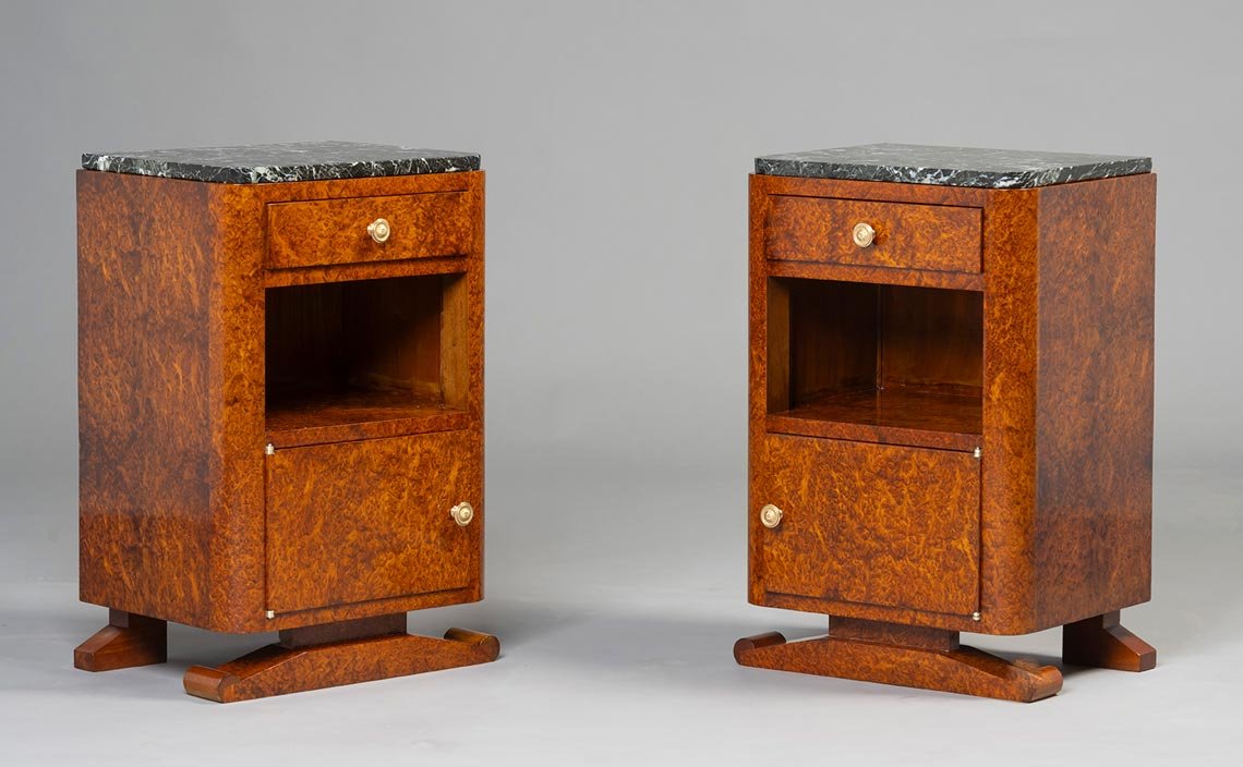 A Matched Pair of Art Deco Nightstands in the Manner of Jules Leleu Amboyna veneer with marble top and cast brass pulls. France, circa 1930. 25.5"h x 17.5"w x 13"d Offered by ILIAD Design For further information call 212.935.4382, email info@iliadny.com or visit www.iliadny.com |