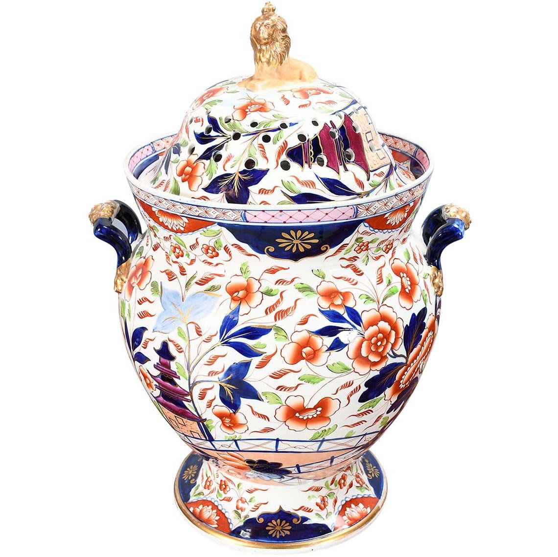 Ironstone Potpourri Vase in "Imari" Pattern An ironstone potpourri vase in "Imari" pattern. The pierced, domed cover is surmounted by a gold lion wearing a crown. There is a secondary cover beneath. Decorated with flowers and a fence. The handles bear a lion mask and end in lions' paws. Unmarked. English, circa 1830. 13" wide, 11" deep, 17.5" high. $3,950 Offered by Jayne Thompson Antiques For further information call 859.748.5628, email info@jaynethompsonantiques.com or visit www.jaynethompsonantiques.com |